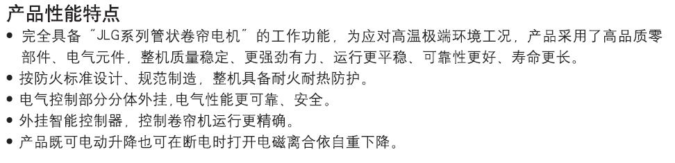 完全具备“JLG系列管状卷帘电机”的工作功能,为应对高温极端环境工况,产品采用了高品质零部件、电气元件,整机质量稳定、更强劲有力、运行更平稳、可靠性更好、寿命更长。